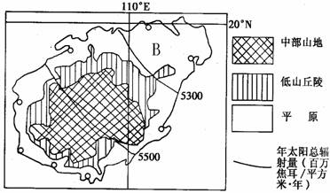 (4)概括B岛年太阳总辐射总量的分布特点,并分析原因。(3分)