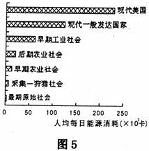 图5为“人类各发展阶段的人均日能源消耗(包括直接消耗和间接消耗)",读图回答12-14题