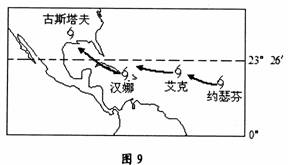 2008年9月上旬,飓风“古斯塔夫 ”、“汉娜 ”、“艾克’”和“约瑟芬”排着队穿越大西洋,向加勒比地区和美国东南沿海袭来,使途径地区遭受严重的生命财产损失。结合图9,回答21-22题。