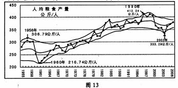 材料一:图13为“我国人均粮食产量变化图’,图中人均粮食产量围绕着趋势线在一个通道内波动,从中间的趋势线到通道边沿的宽度,即为平均的波幅,平均波幅与趋势值之比,表示粮食产量的稳定性高低.波幅越大,粮仓产量越不稳定。