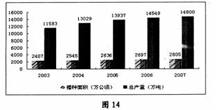 材料二:“2003-2007年我国玉米播种面积及总产量变化趋势图”(图14).