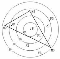 右图中,M1、M2、M3分别为原料地、燃料地和市场。图中P点是某企业生产产品的运费最低点和劳动力费用最高点。以P为圆心的同心圆是该企业的等运费线(单位:元)。据此回答13―15题。
