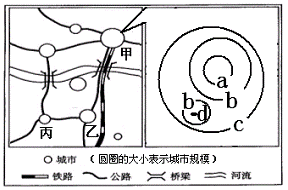 读某地区城市分布及图中甲城市地租等值线示意图,完成25―26题。