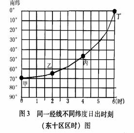 (2008年广东卷)图为某日观测到的同一经线上不同纬度的日出时刻(东十区区时)。此时,东十区区时为12时。读图回答1-4题