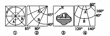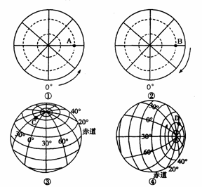 (4)若A点某日昼夜平分,且时刻为14 :00,在图中用阴影画出这一时刻夜半球的范围。.