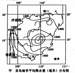 28.(2007年东城1月)图甲所示岛屿,从岛西北的洋浦港到岛西南的莺歌海的沙质海岸平原、河流三角洲及部分沙质台地上,形成一个狭长带状的沙漠化土地分布区。回答下列问题。