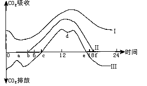 A.在Ⅲ曲线与时间轴交点c和e时,光合作用吸收的CO2和呼吸作用释放的CO2量相等