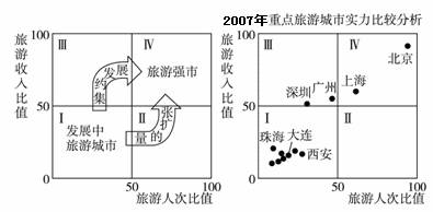 13.2007年“五一黄金周”期间,我国旅游市场异常火爆。读“中国重点城市旅游实力比较图”,有关图中各城市的叙述,正确的是