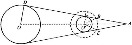 如图所示,O和O/ 分别表示地球和月球的中心。在卫星轨道平面上,A是地月连心线OO/ 与地月球面的公切线ACD的交点,D、C和B分别是该公切线与地球表面、月球表面和卫星圆轨道的交点。根据对称性,过A点在另一侧作地月球面的公切线,交卫星轨道于E点。卫星在 运动时发出的信号被遮挡。