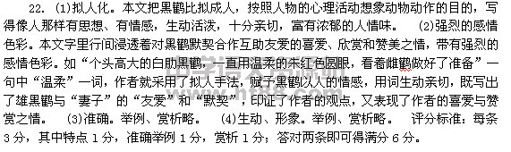 21.(1)能够关爱、理解和体谅对方,真诚为对方着想。雄鹳总是主动承担重担,具有奉献精神。雌鹳也不是坐享其成,而是尽其所能。双方既分工又合作,齐心协力,相互配合,轮流上阵,互助互惠,满足双方的需求。 (2)注意情感交流。在遇到挫折雄鹳情绪不稳定时,雌鹳理智劝慰、安抚,使其平静,共同寻找新的起点。 评分标准:每一个要点2分,共4分。