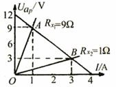 图像如图所示,由图可分析找到滑动变阻器的发热功率为9W的A点和B点,所以Rx有两个值。