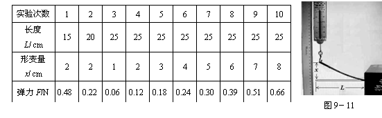 4.小明弯曲手中的钢锯片,感觉到弹力大小与弯曲程度有关,同时他猜想,弹力大小可能还跟钢锯片的长度有关。于是他和同学合作进行了图9―11所示的实验,将钢锯片夹在厚书内,伸出的长度(简称长度)用L表示;钢锯片形变量(弯曲程度)用末端侧移量x表示,钢锯片的弹力用F表示,其大小等于测力计的读数。实验数据如下表。