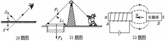 评分标准:20题成像2分,光路图1分,21题动力F1、阻力F2和力臂L1各1分,22题磁感线方向、磁极极性和螺线管的绕法各1分。