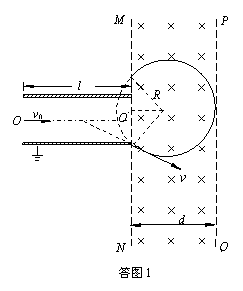 (2)粒子运动轨迹如答图1所示,设粒子运动轨迹刚好与右边界相切,这时磁场宽度为d,则            (3分)